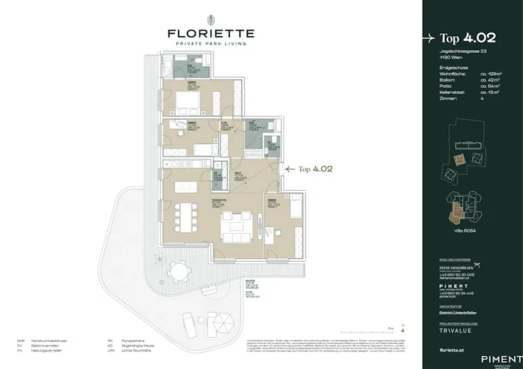 Auf unglaublichen 12.000 m2 Parkfläche entsteht im Projekt FLORIETTE eine eigene Welt inmitten von Hietzing, einem der begehrtesten und exklusivsten Wohnviertel Wiens. Eine moderne Luxusresidenz mit insgesamt 63 eleganten Wohnungen, aufgeteilt auf das imposante „Stadthaus Floriette“ mit klassischem Altbauflair und drei elegante Neubauvillen. Das Projekt besticht mit moderner, unaufdringlicher Architektur, großzügigen Flächen und Panoramafenstern, die sich harmonisch in das Areal einfügen.