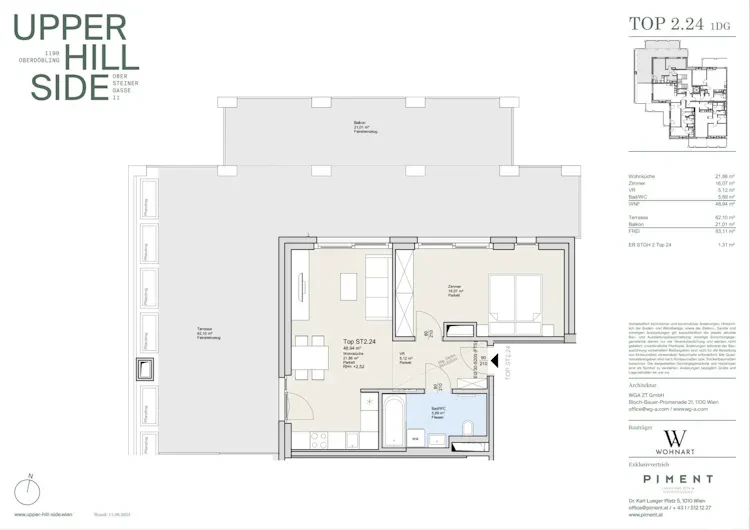 UPPER HILL SIDE, das sind die Stadt und der Park, von oben betrachtet. Das zeitgenössische Haus mit 59 Apartments steht im Herzen von Oberdöbling. Schon die Römer haben die hohe, freie Lage des Stadtteils am Hügel als wertvoll erkannt. Aber nicht nur sie: Großzügige Fenster rahmen heute den Blick auf Wiens Vielfalt. Balkone, Terrassen und Gärten schaffen eine Verbindung zum grün-urbanen Rundum. UPPER HILL SIDE in der Obersteinergasse 11 schwebt über den Dingen.