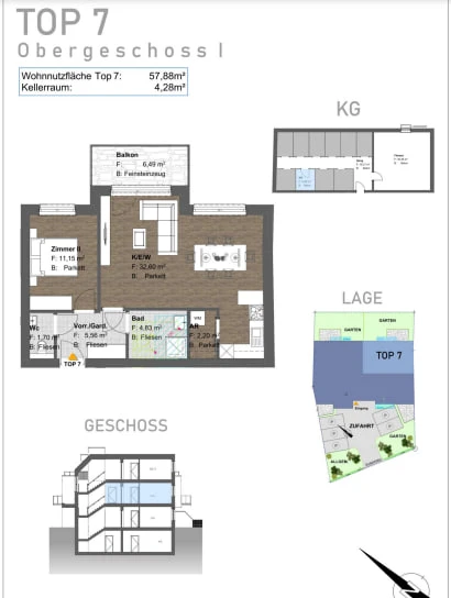 Das Wohnhaus wird in Massivbauweise errichtet und besteht aus 4 Geschoßen mit 10 Wohneinheiten sowie Keller mit Fitnessraum. Die Wohnungen im Erdgeschoß verfügen über einen Eigengarten, die Wohnungen ab Obergeschoß großzügige Terrassen- oder Loggiaflächen.